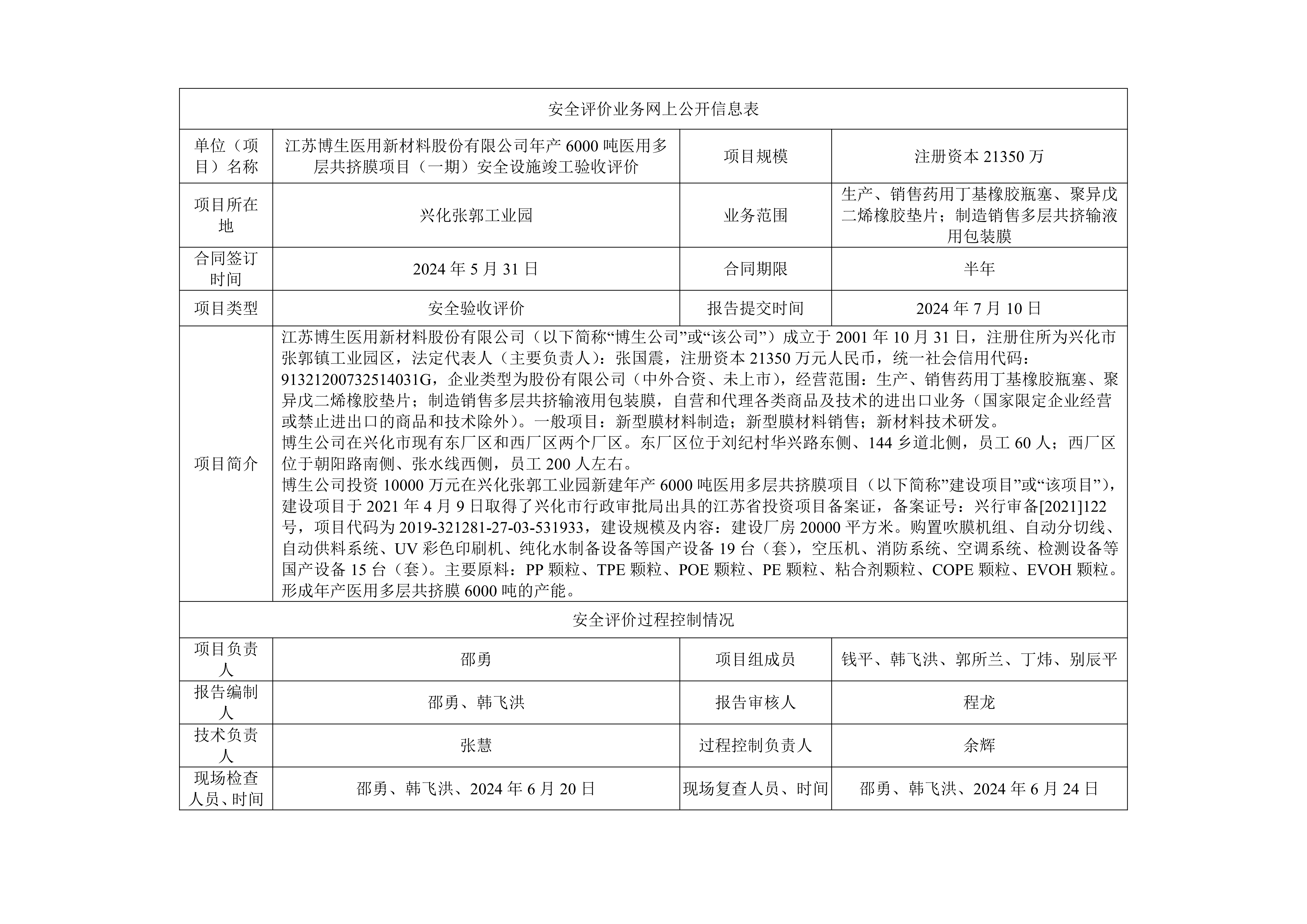 江苏博生医用新材料股份有限公司年产6000吨医用多层共挤膜项目(一期)安全设施竣工验收评价