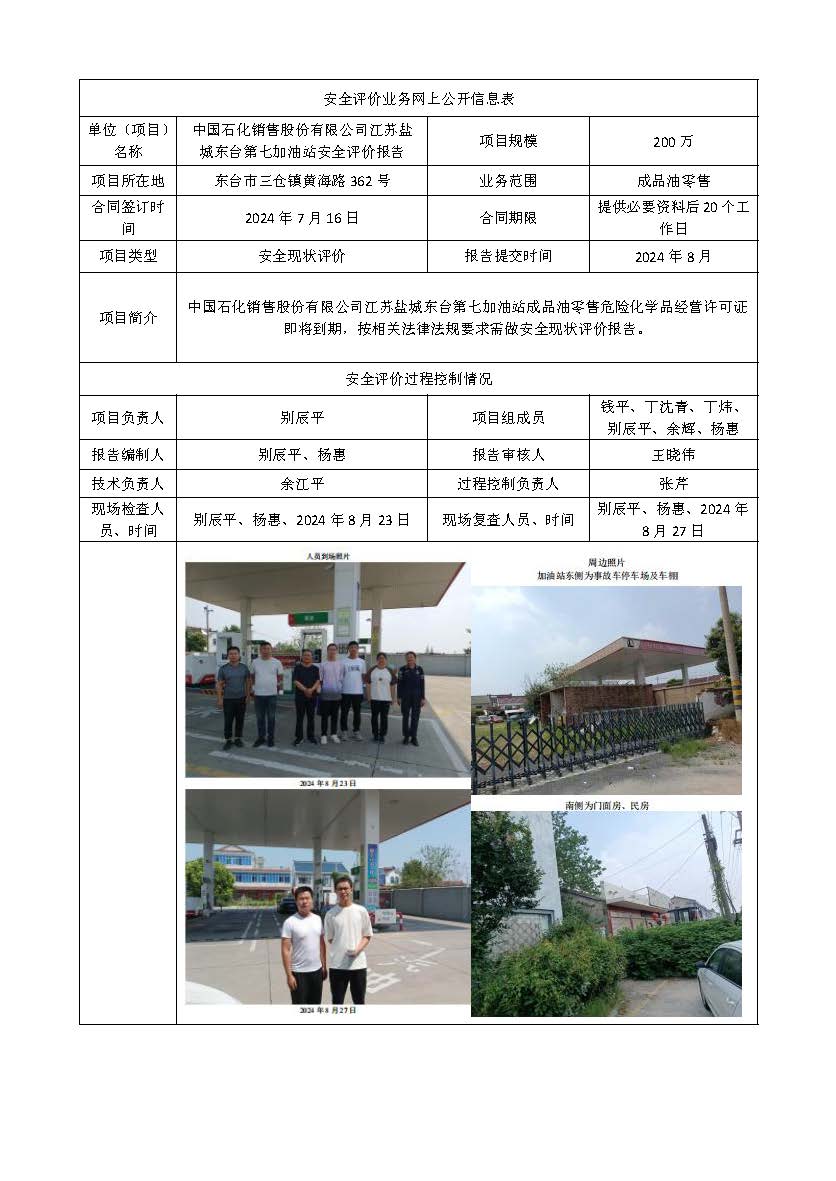 中国石化销售股份有限公司江苏盐城东台第七加油站安全现状评价2024