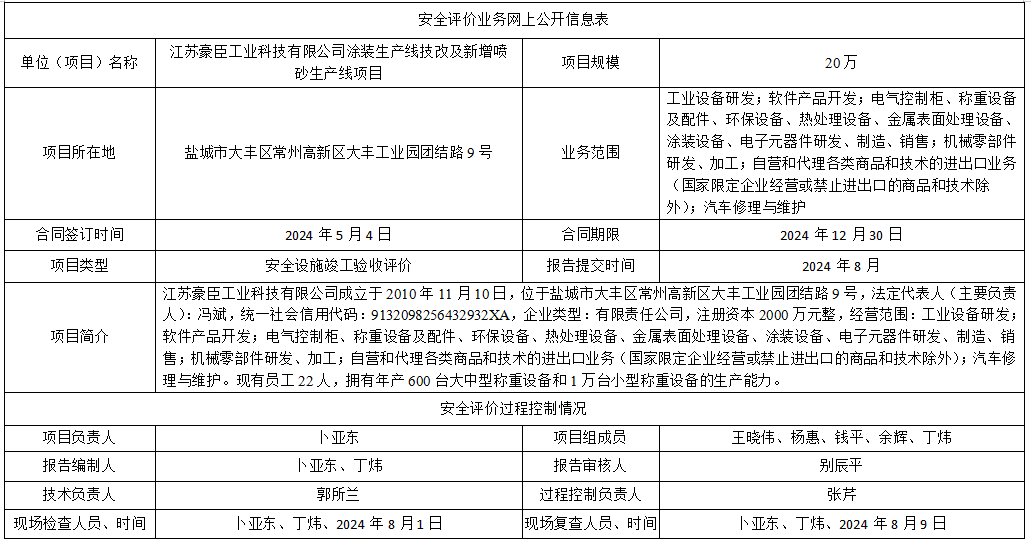 江苏豪臣工业科技有限公司涂装生产线技改及新增喷砂生产线项目