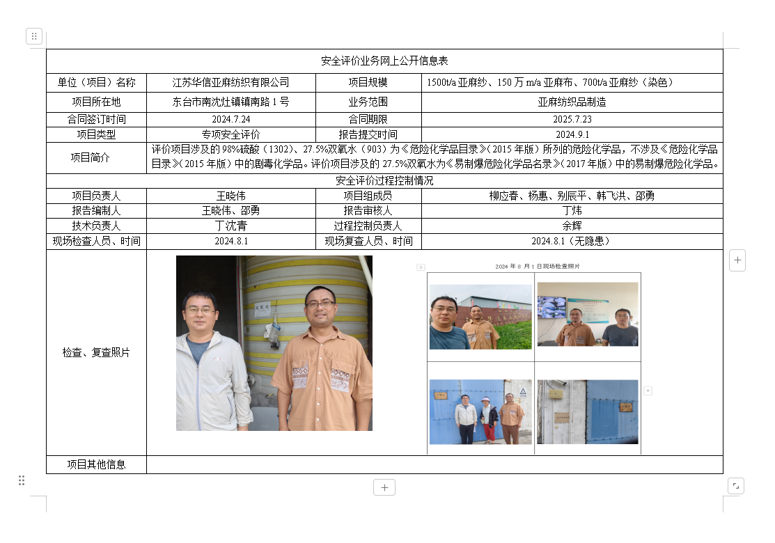 江苏华信亚麻纺织有限公司易制爆危险化学品、易制毒化学品储存场所治安防范状况、污水站专项安全评价