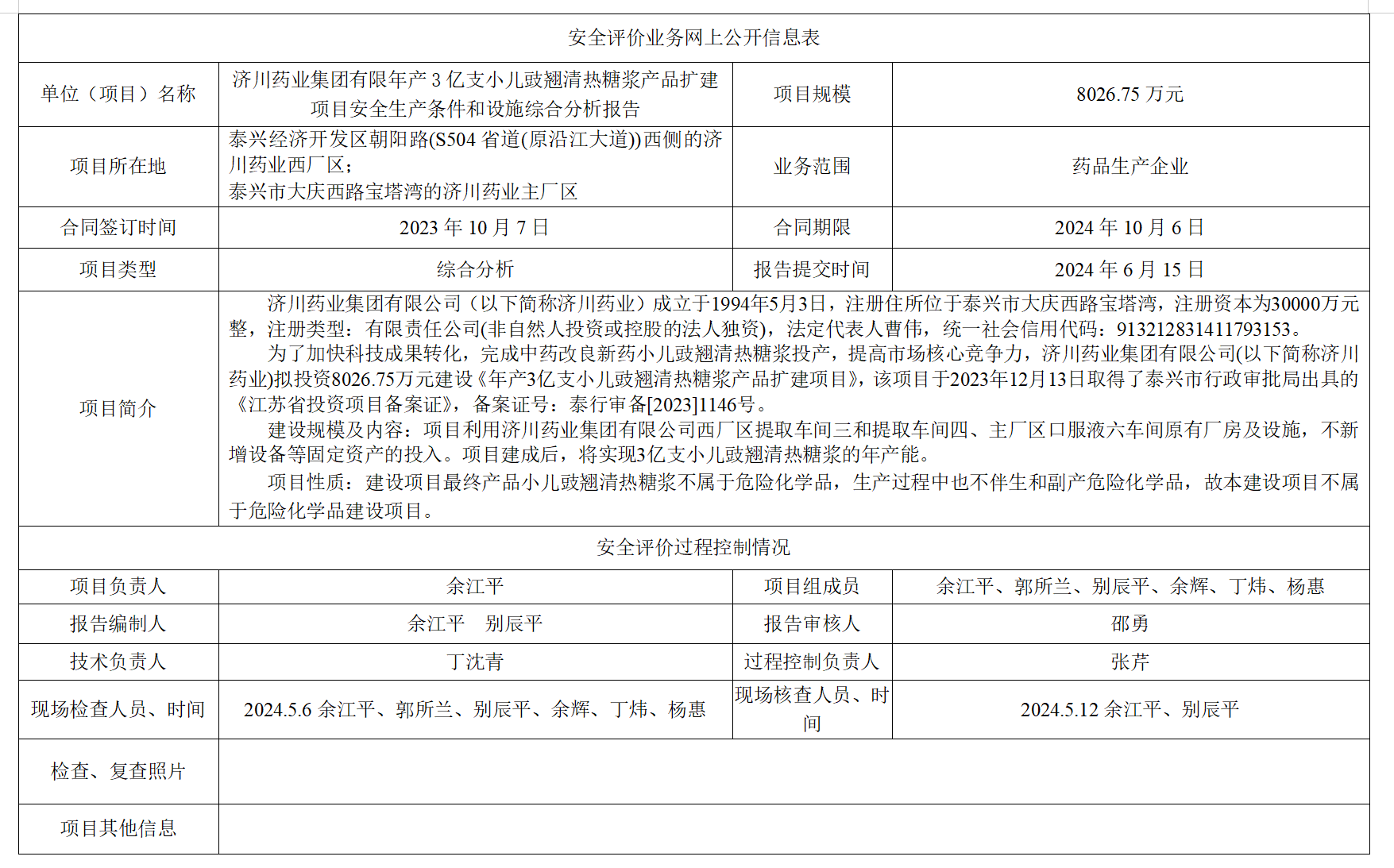 济川药业集团有限年产3亿支小儿豉翘清热糖浆产品扩建项目安全生产条件和设施综合分析报告