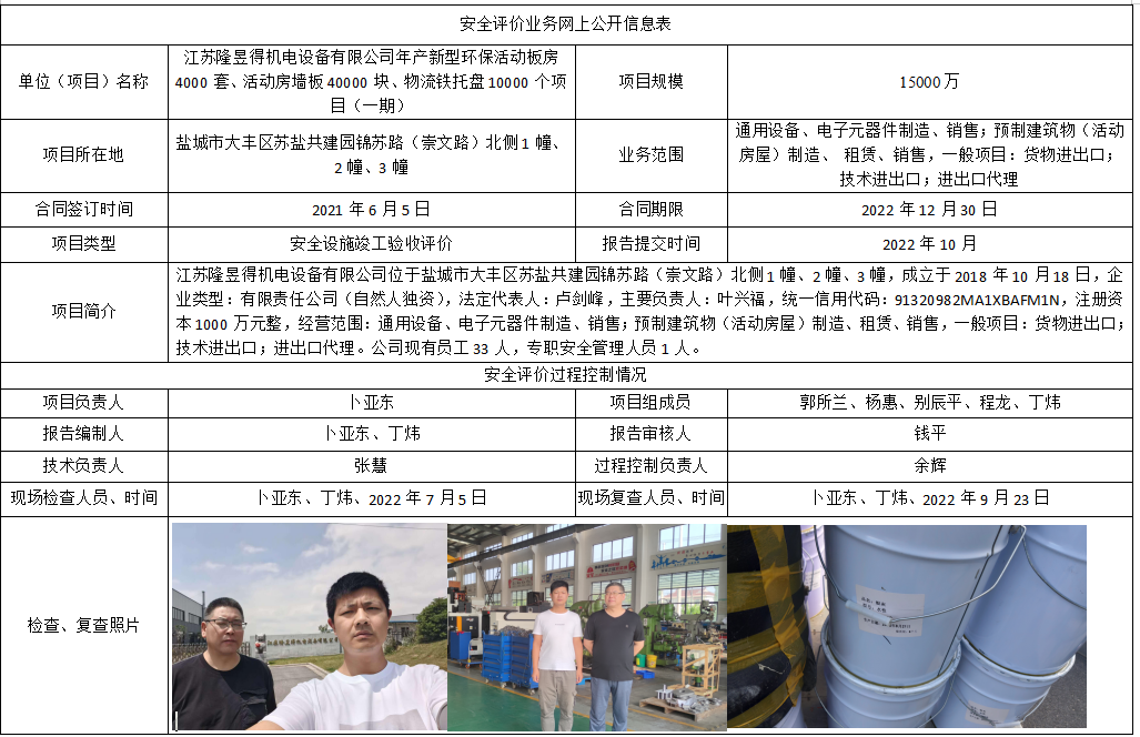 江苏隆昱得机电设备有限公司年产新型环保活动板房4000套、活动房墙板40000块、物流铁托盘10000个项目(一期)验收