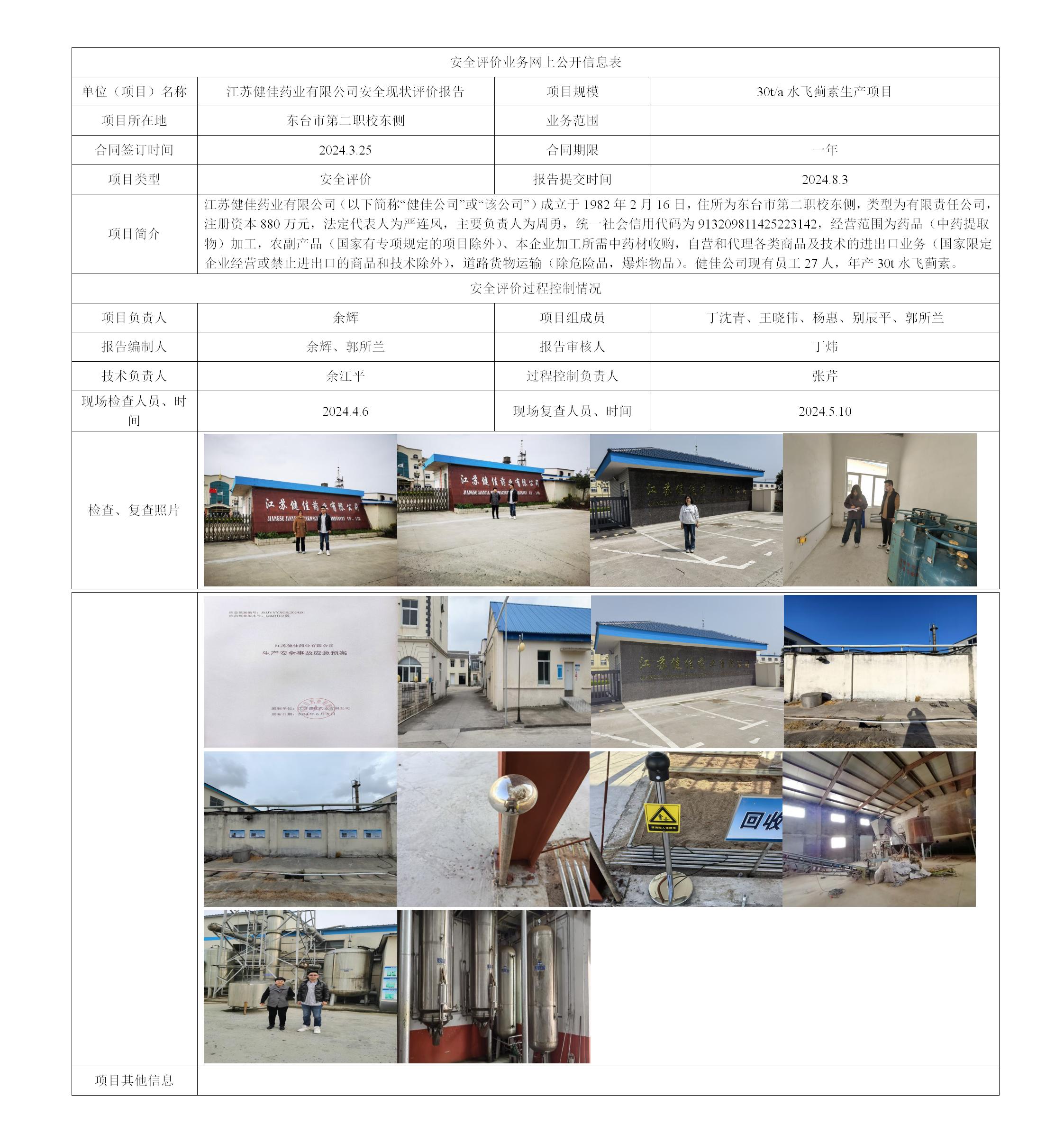 江苏健佳药业有限公司 30t/a水飞蓟素生产项目安全现状评价