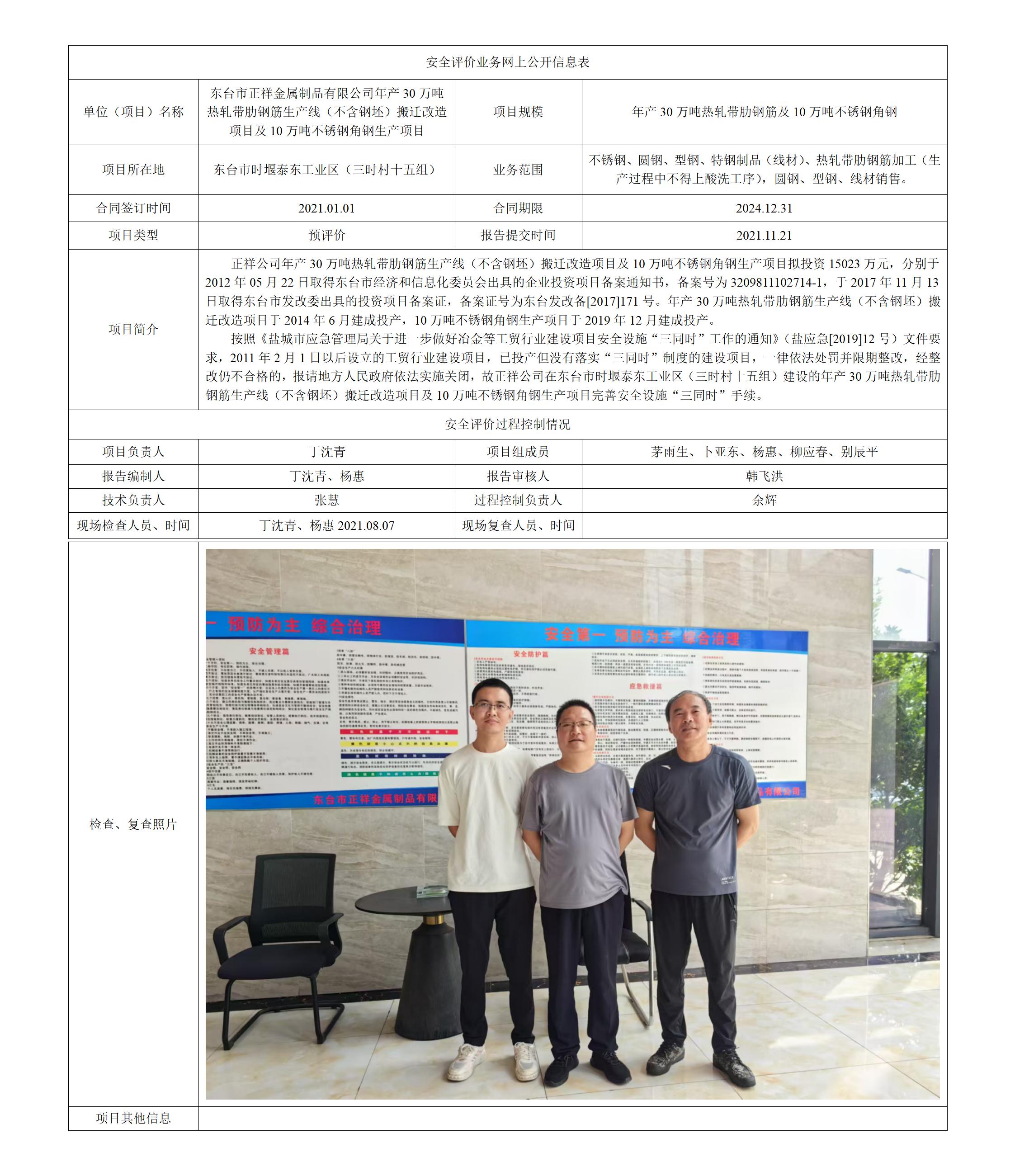 东台市正祥金属制品有限公司年产30万吨热轧带肋钢筋生产线(不含钢坯)搬迁改造项目及10万吨不锈钢角钢生产项目预评价