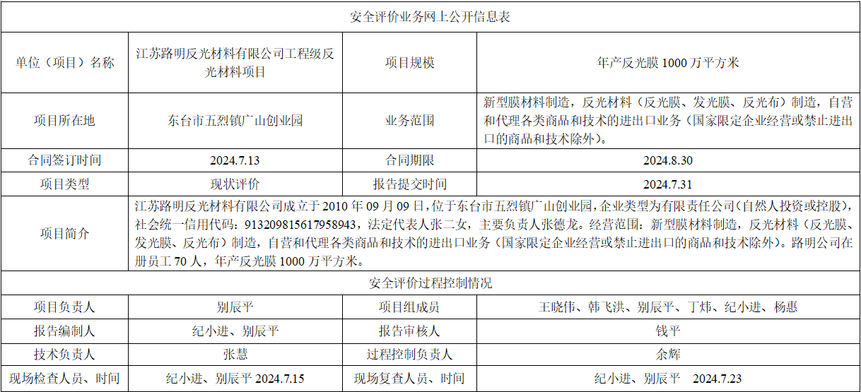 江苏路明反光材料有限公司工程级反光材料项目安全现状评价报告