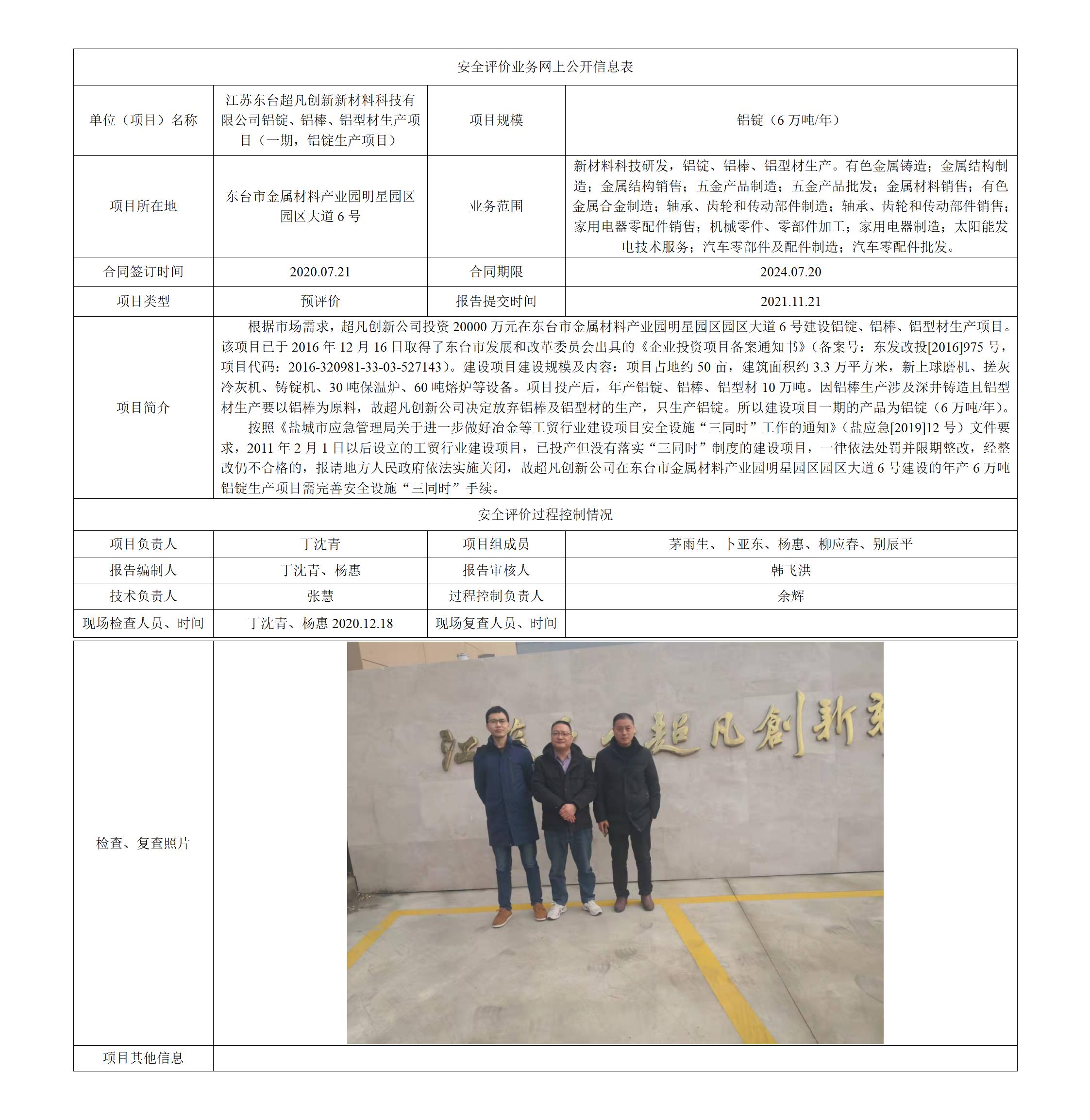 江苏东台超凡创新新材料科技有限公司铝锭、铝棒、铝型材生产项目(一期,铝锭生产项目)安全预评价报告