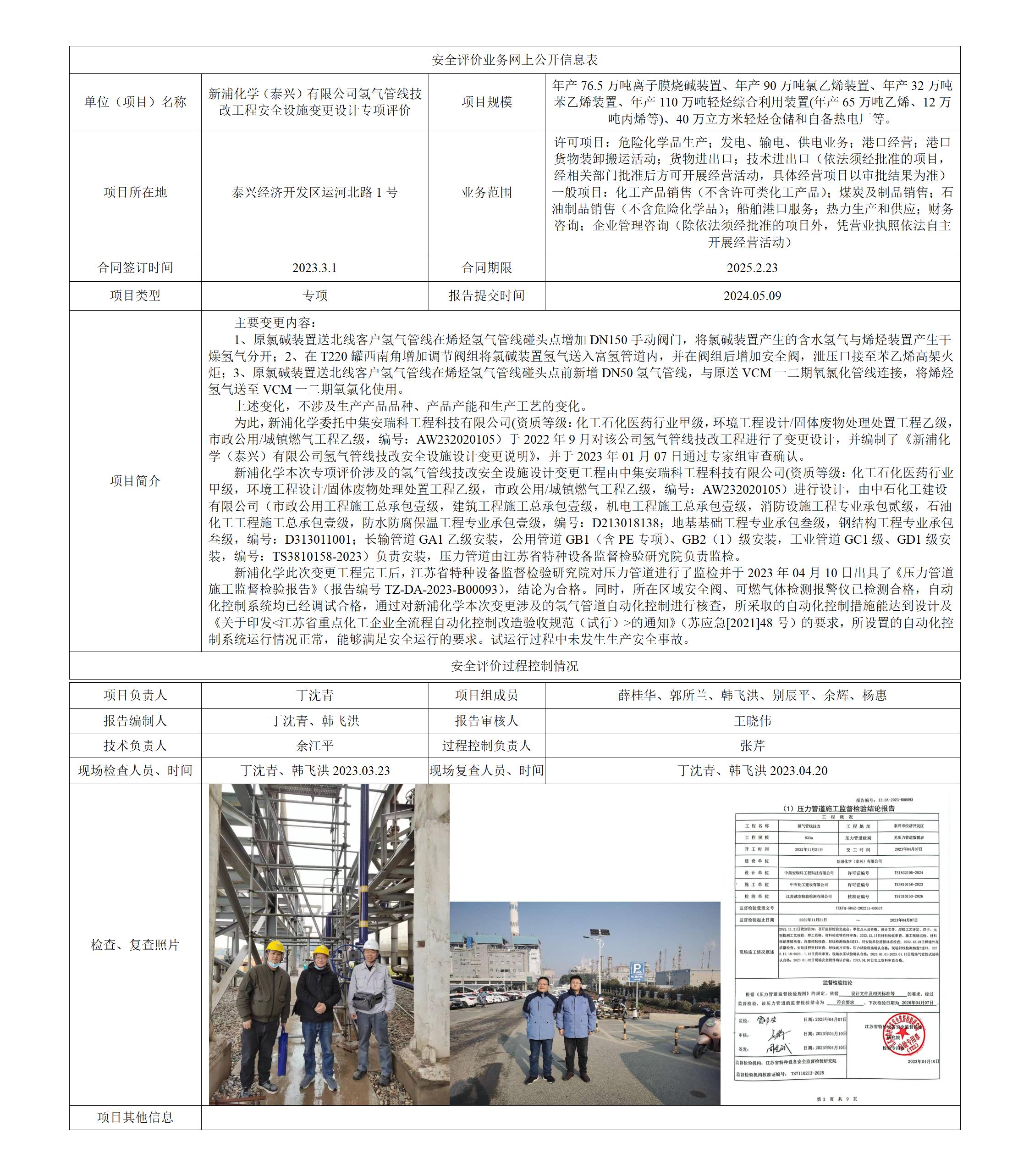 新浦化学(泰兴)有限公司氢气管线技改工程安全设施变更设计专项评价