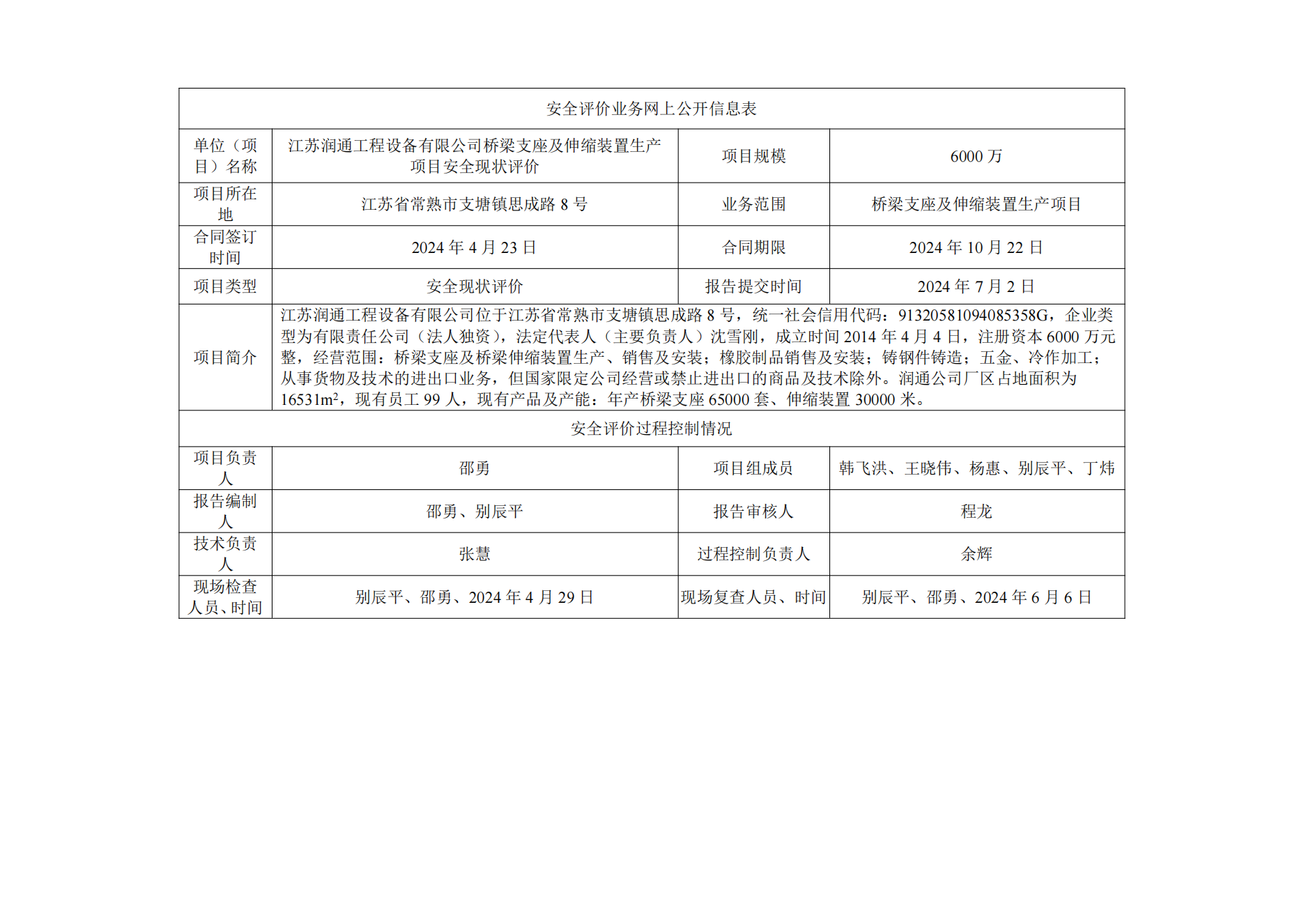 江苏润通工程设备有限公司桥梁支座及伸缩装置生产项目安全现状评价