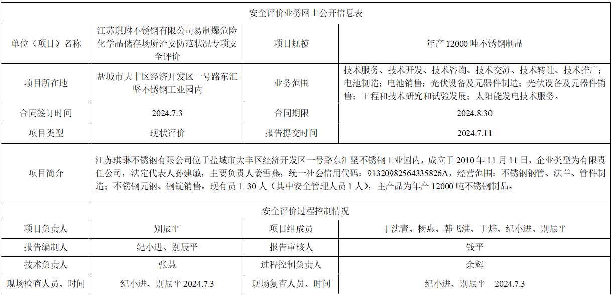 江苏琪琳不锈钢有限公司易制爆危险化学品储存场所治安防范状况专项安全评价