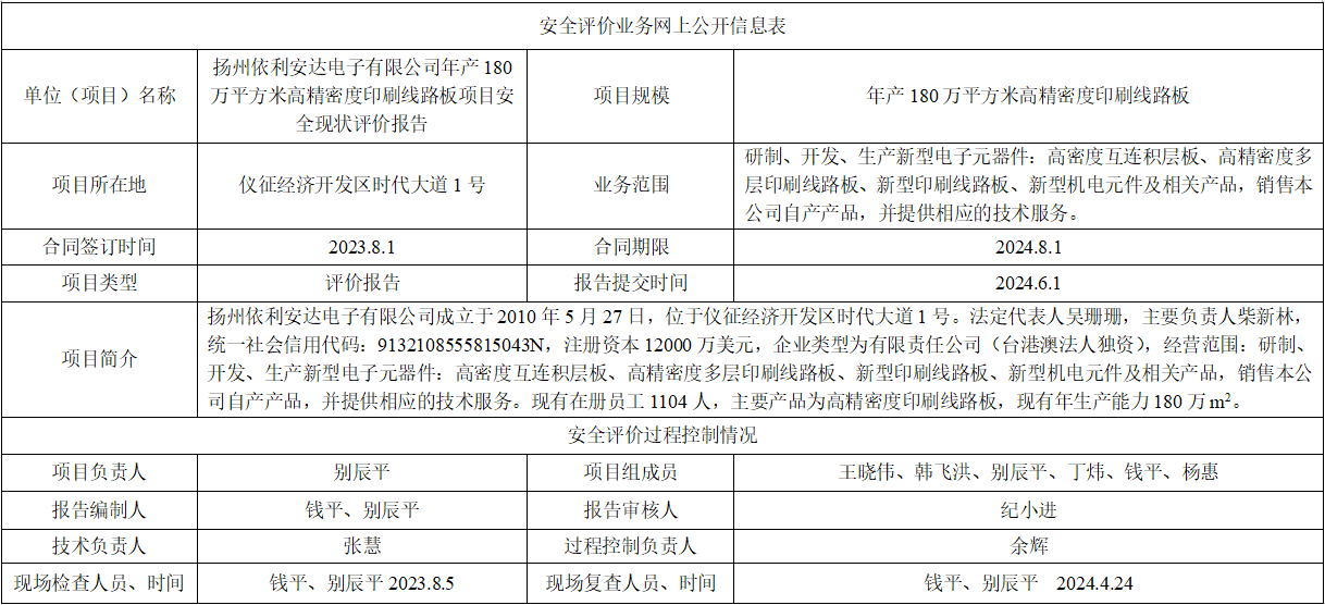 扬州依利安达电子有限公司年产180万平方米高精密度印刷线路板项目安全现状评价报告