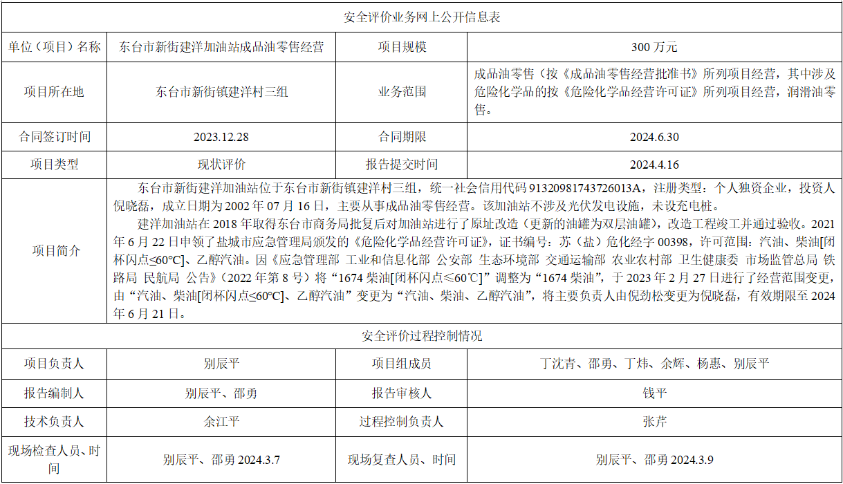 东台市新街建洋加油站成品油零售经营项目安全评价报告