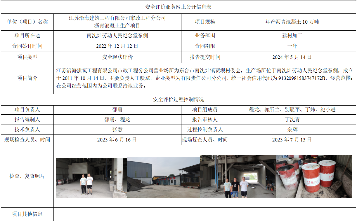 江苏沿海建筑工程有限公司市政工程分公司沥青混凝土生产项目安全现状评价报告