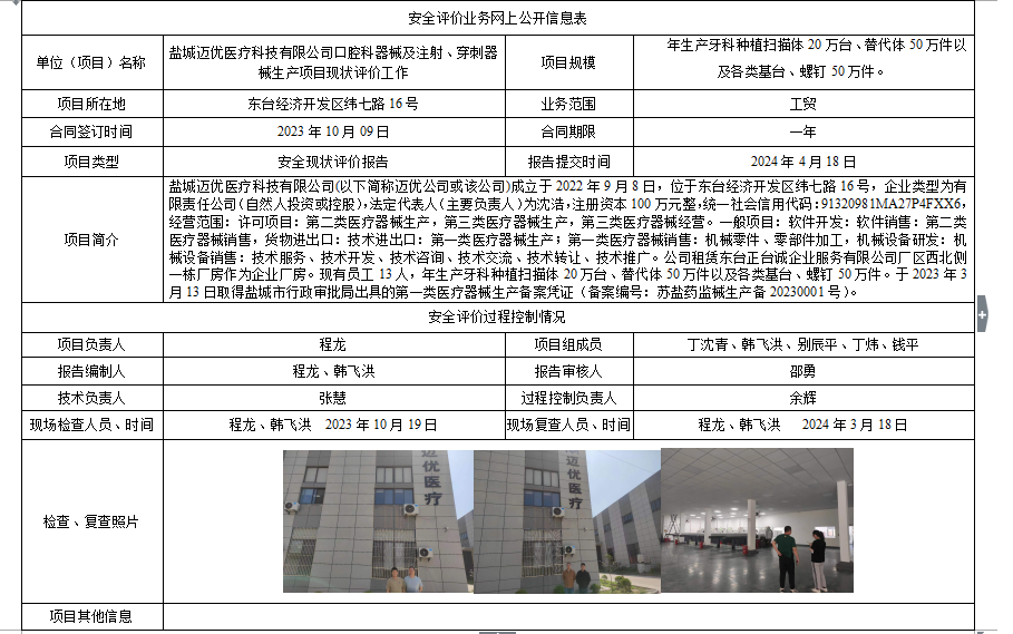 盐城迈优医疗科技有限公司 口腔科器械及注射、穿刺器械生产项目安全现状评价报告