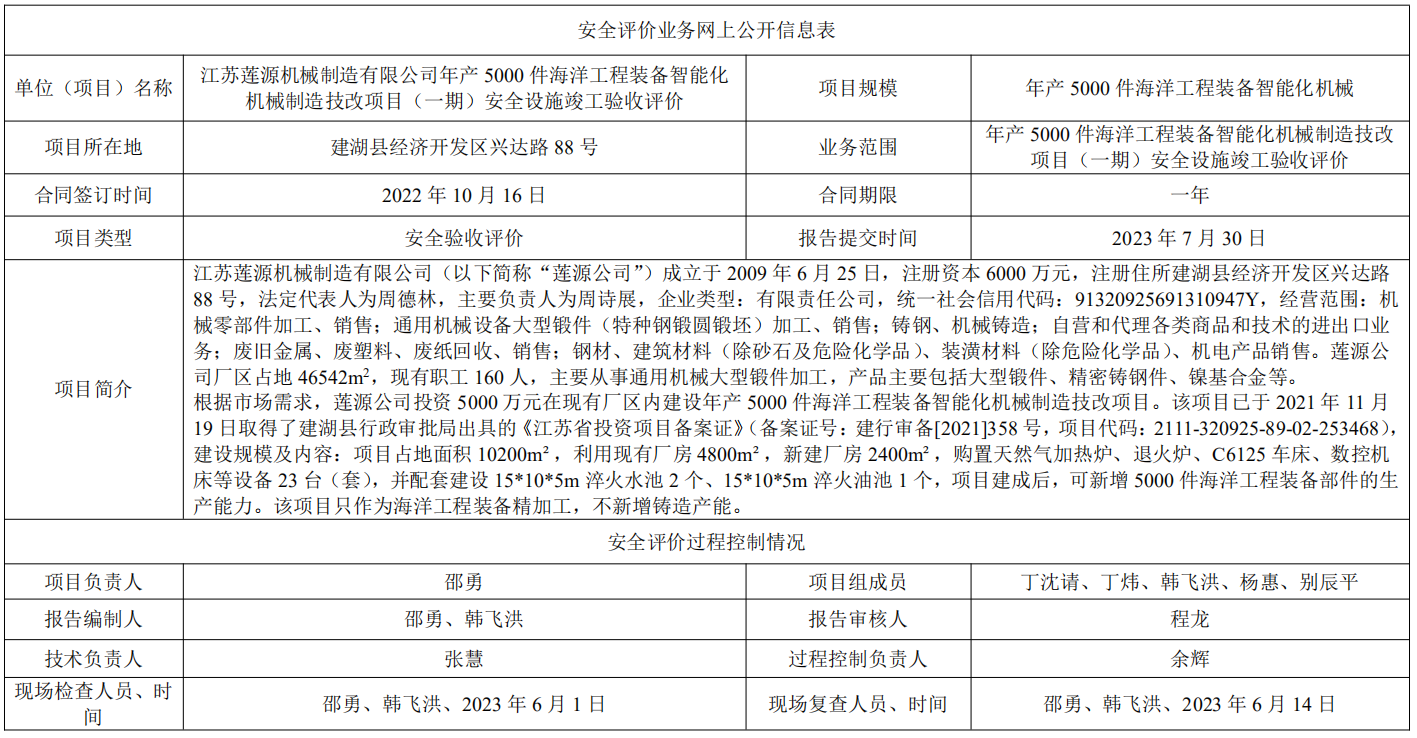 江苏莲源机械制造有限公司年产5000件海洋工程装备智能化机械制造技改项目(一期)安全设施竣工验收评价