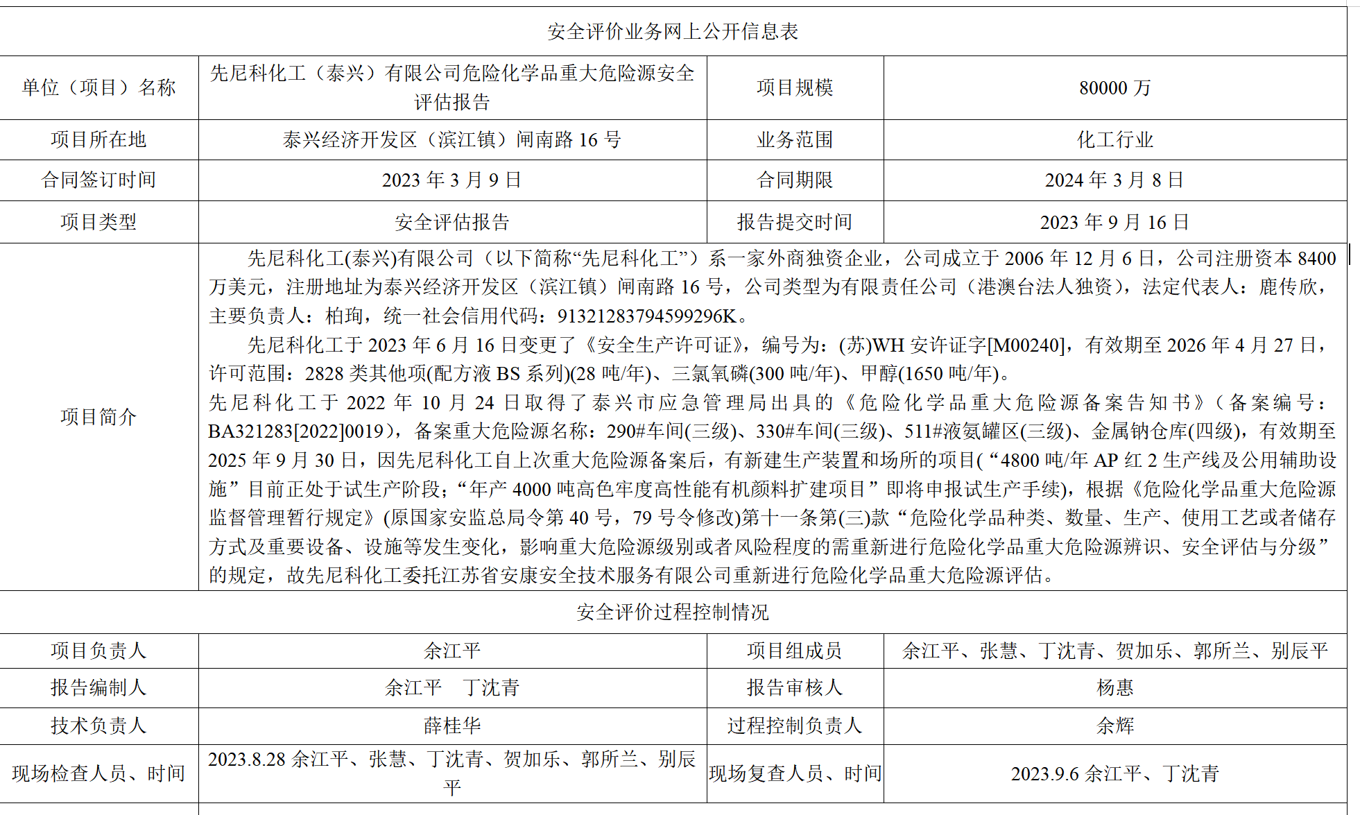 先尼科化工(泰兴)有限公司危险化学品重大危险源安全评估报告