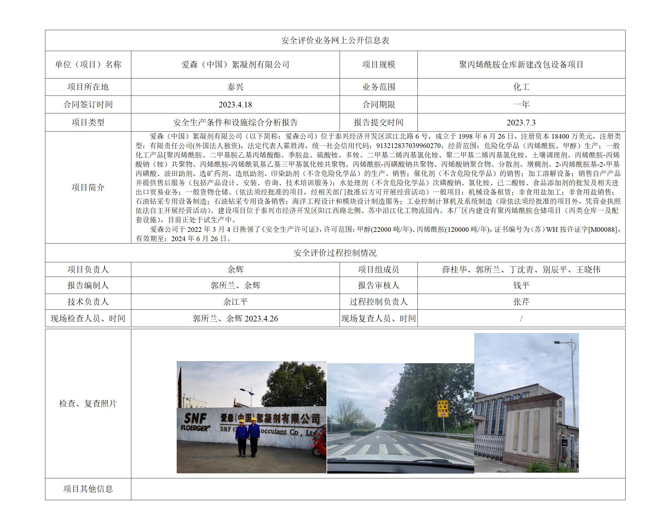爱森(中国)絮凝剂有限公司 聚丙烯酰胺仓库新建改包设备项目 安全生产条件和设施综合分析报告