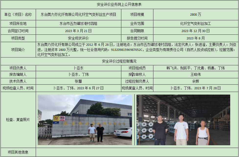 东台奥力芬化纤有限公司化纤空气变形丝生产项目