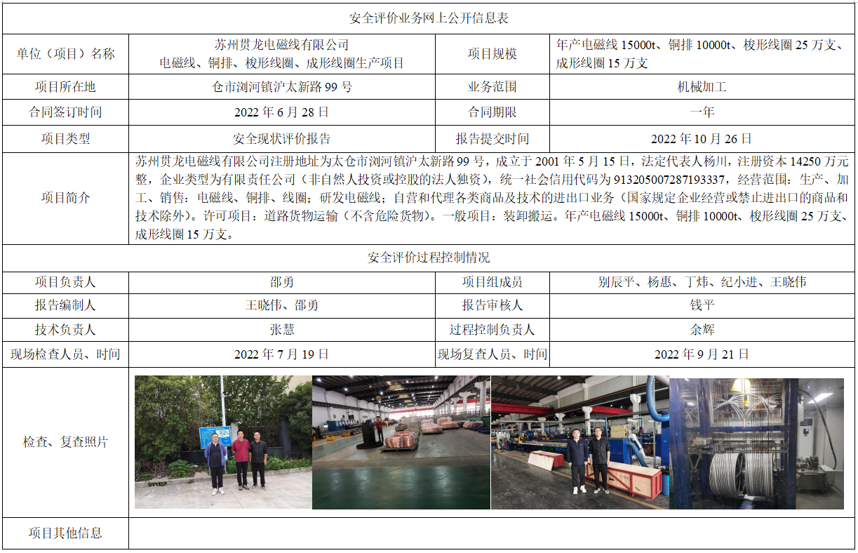 苏州贯龙电磁线有限公司电磁线、铜排、梭形线圈、成形线圈生产项目安全现状评价报告