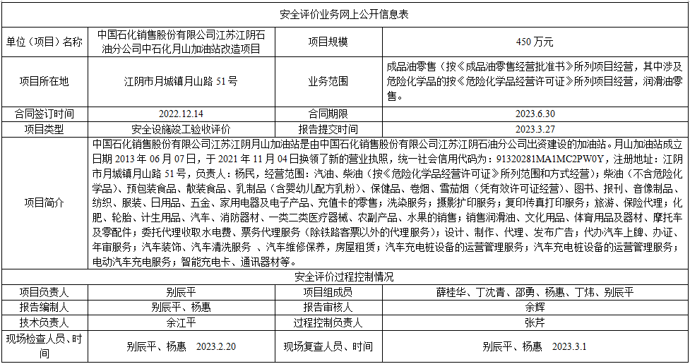 中国石化销售股份有限公司江苏江阴石油分公司中石化月山加油站改造项目安全设施竣工验收评价