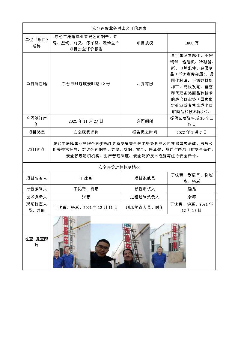 东台市康隆车业有限公司钢带、铝肩、型钢、前叉、停车架、哑铃生产项目安全评价报告