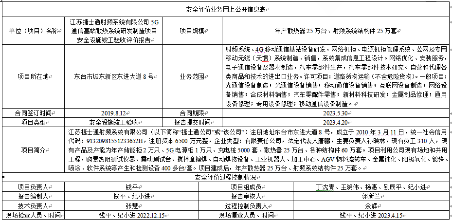 江苏捷士通射频系统有限公司5G通信基站散热系统研发制造项目安全设施竣工验收评价报告