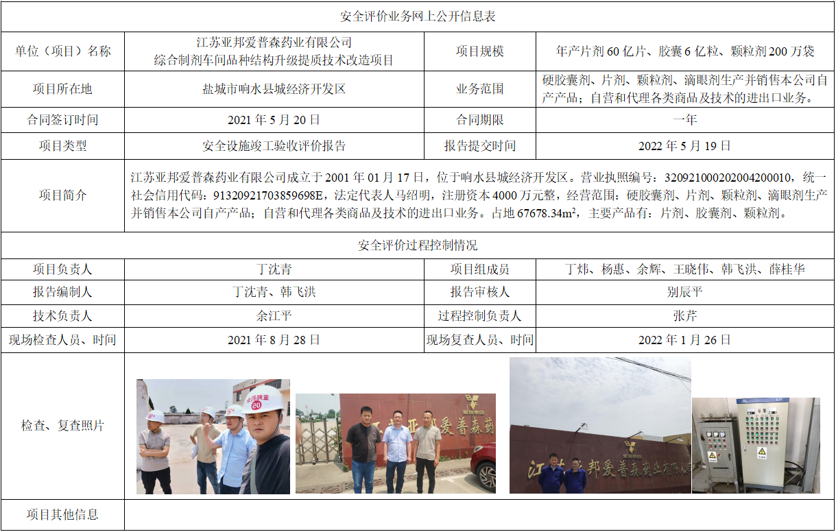 江苏亚邦爱普森药业有限公司综合制剂车间品种结构升级提质技术改造项目安全设施竣工验收评价报告