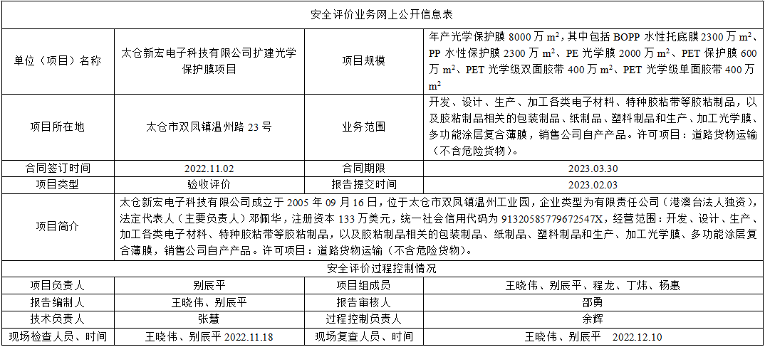 太仓新宏电子科技有限公司扩建光学保护膜项目安全设施竣工验收评价