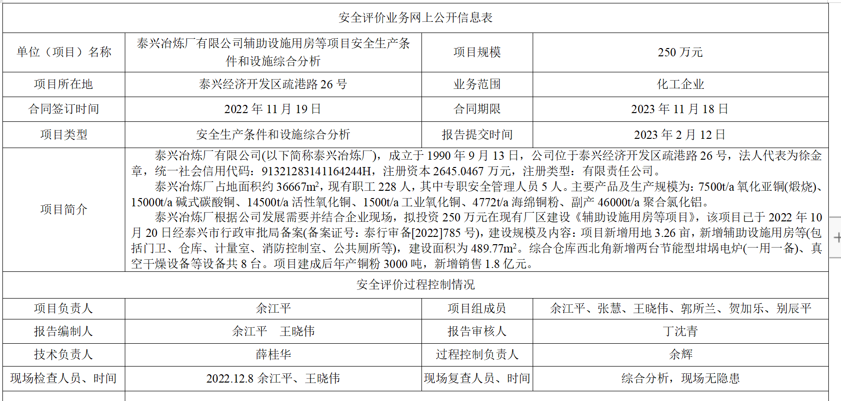 泰兴冶炼厂有限公司辅助设施用房等项目安全生产条件和设施综合分析
