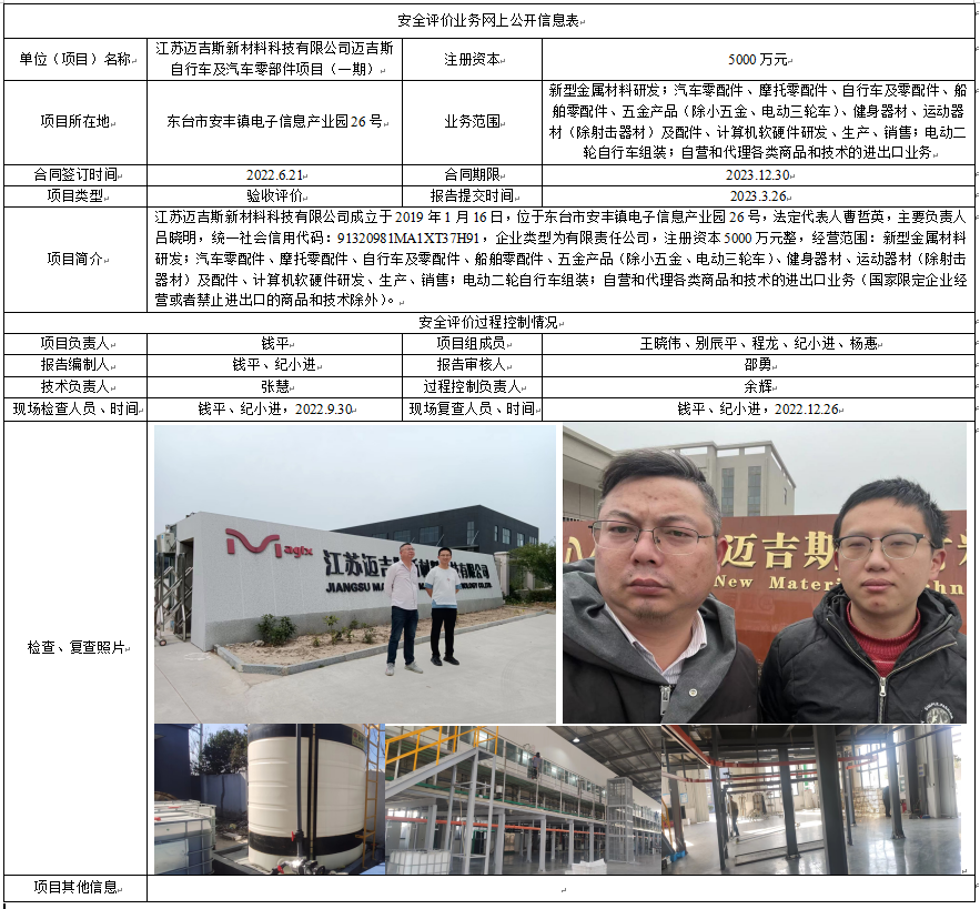 江苏迈吉斯新材料科技有限公司迈吉斯自行车及汽车零部件项目(一期)验收评价