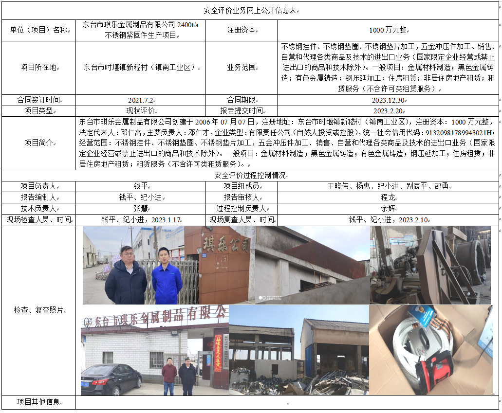 东台市琪乐金属制品有限公司2400t/a不锈钢紧固件生产项目安全现状评价报告