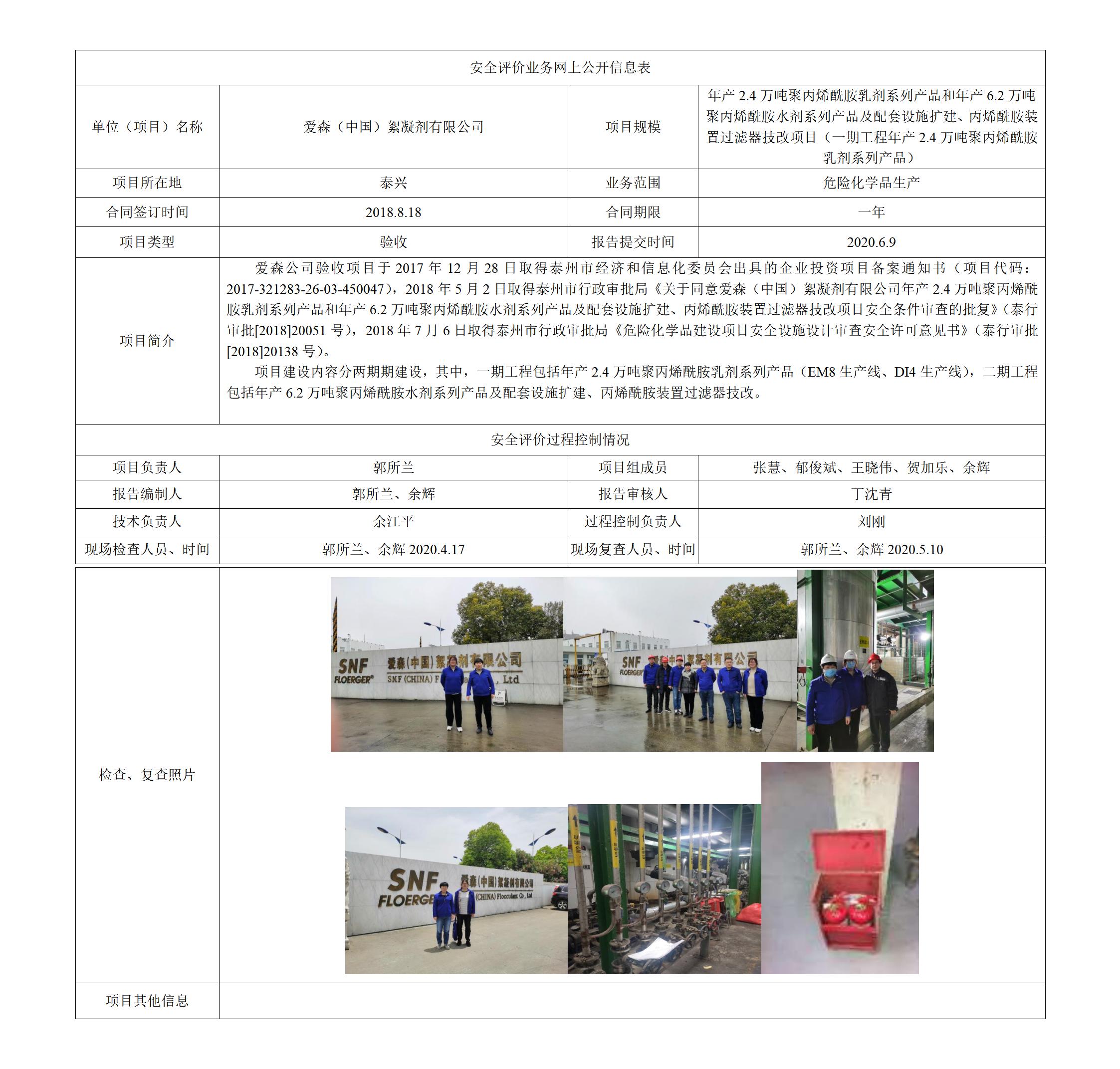 爱森(中国)絮凝剂有限公司年产2.4万吨聚丙烯酰胺乳剂系列产品和年产6.2万吨聚丙烯酰胺水剂系列产品及配套设施扩建、丙烯酰胺装置过滤器技改项目(一期工程年产2.4万吨聚丙烯酰胺乳剂系列产品)安全设施竣工验收