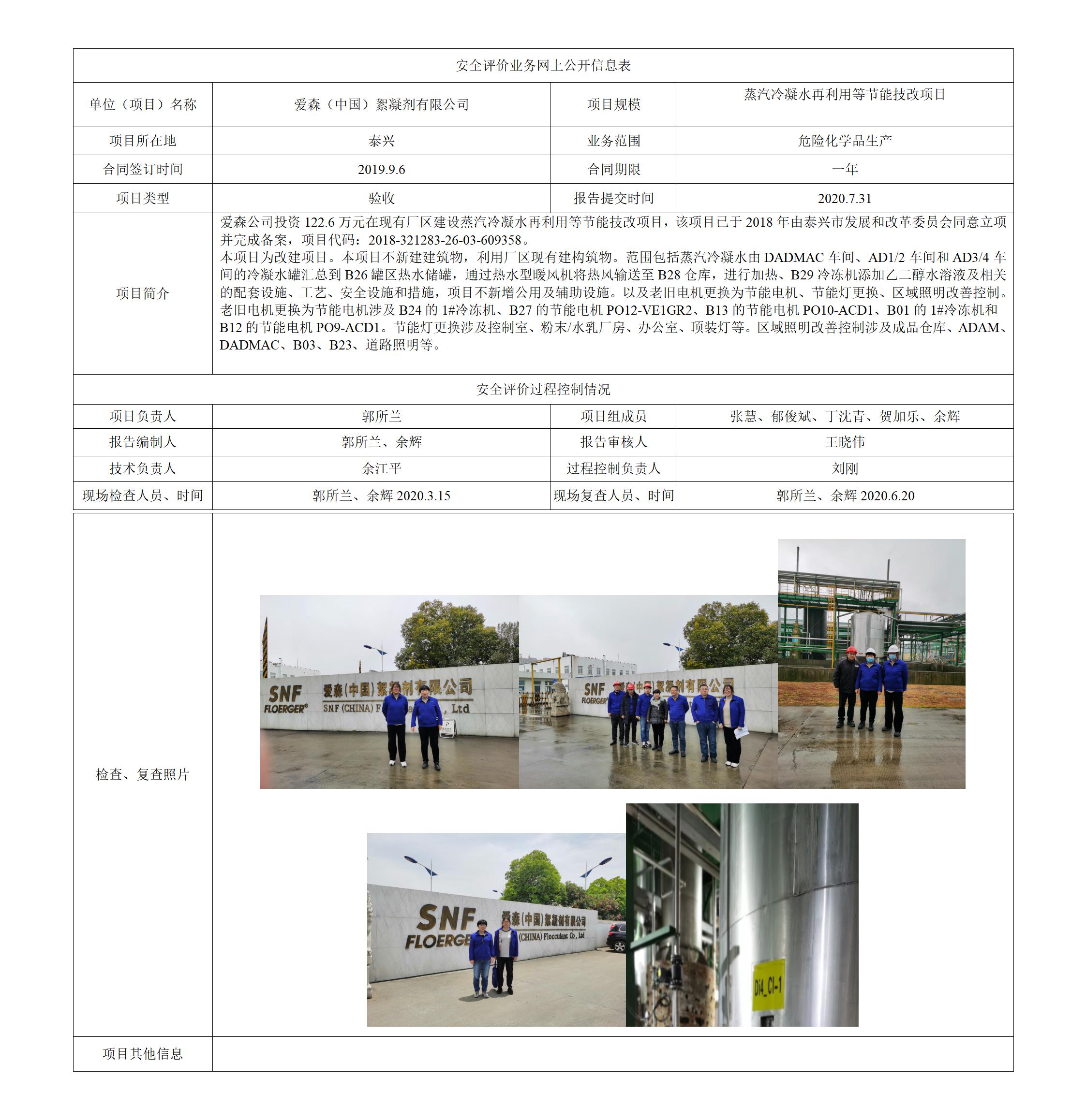 爱森(中国)絮凝剂有限公司 蒸汽冷凝水再利用等节能技改项目 安全验收评价报告