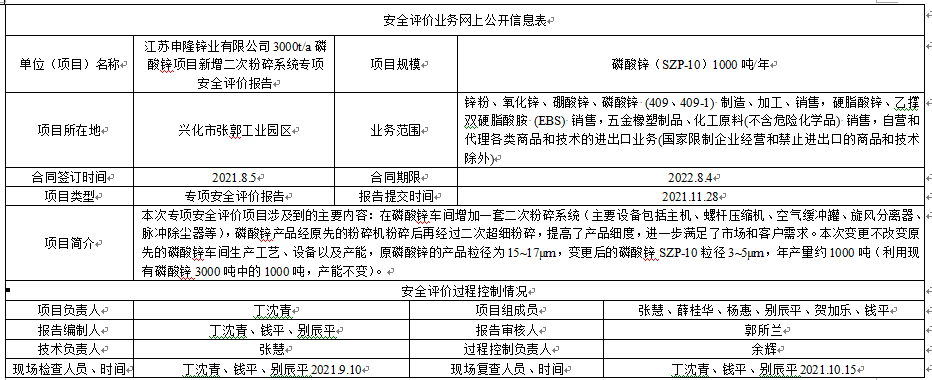 江苏申隆锌业有限公司3000t/a磷酸锌项目新增二次粉碎系统专项安全评价报告