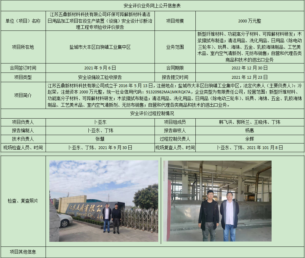 江苏五鼎新材料科技有限公司环保可降解新材料清洁日用品加工项目在役生产装置(设施)安全设计诊断治理工程专项验收评价