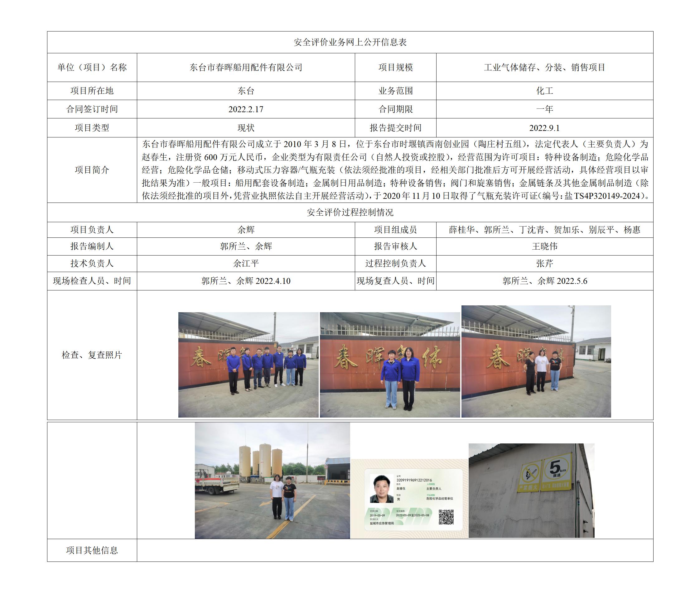 东台市春晖船用配件有限公司工业气体储存、分装、销售项目 安全评价报告