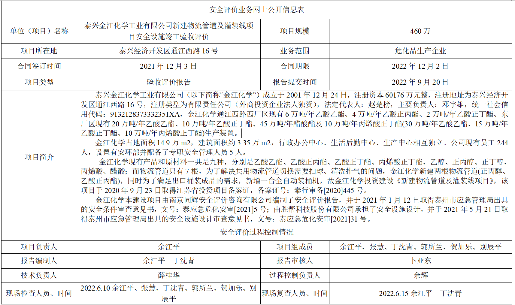 泰兴金江化学工业有限公司新建物流管道及灌装线项目安全设施竣工验收评价