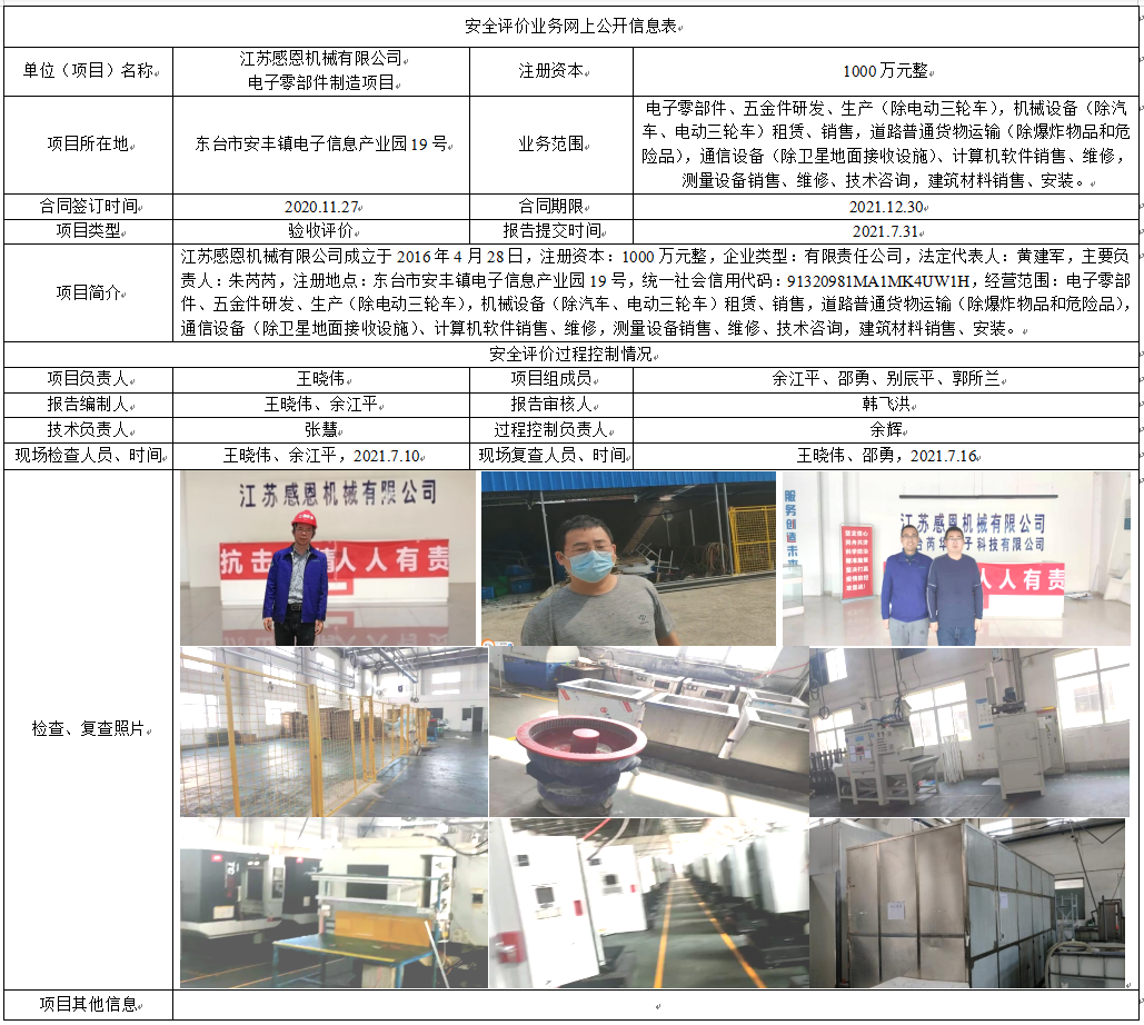 江苏感恩机械有限公司电子零部件制造项目安全设施竣工验收评价报告