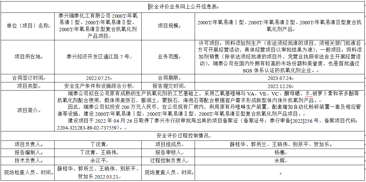 泰兴瑞泰化工有限公司2000T/年氧易清Ⅰ型、2000T/年氧易清Ⅱ型、2000T/年氧易清Ⅲ型复合抗氧化剂产品项目安全生产条件和设施综合分析