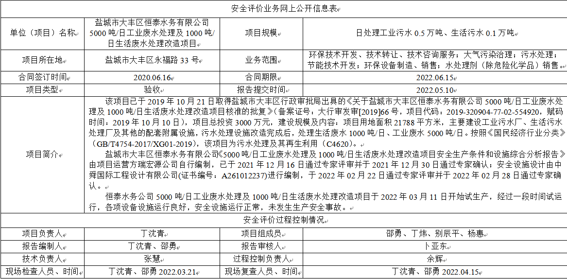 盐城市大丰区恒泰水务有限公司5000吨/日工业废水处理及1000吨/日生活废水处理改造项目安全设施竣工验收评价