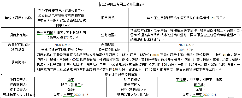 东台正耀精密技术有限公司工业及新能源汽车精密结构件和零组件项目(一期)安全设施竣工验收评价报告