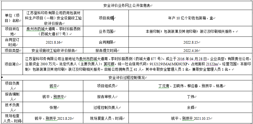 江苏登科印务有限公司药用包装材料生产项目(一期)安全设施竣工验收评价报告