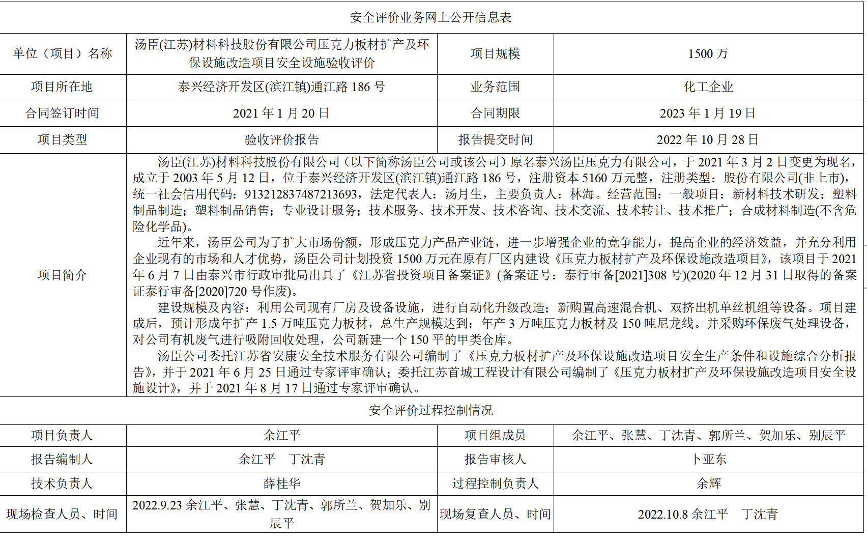 汤臣(江苏)材料科技股份有限公司压克力板材扩产及环保设施改造项目安全设施验收评价