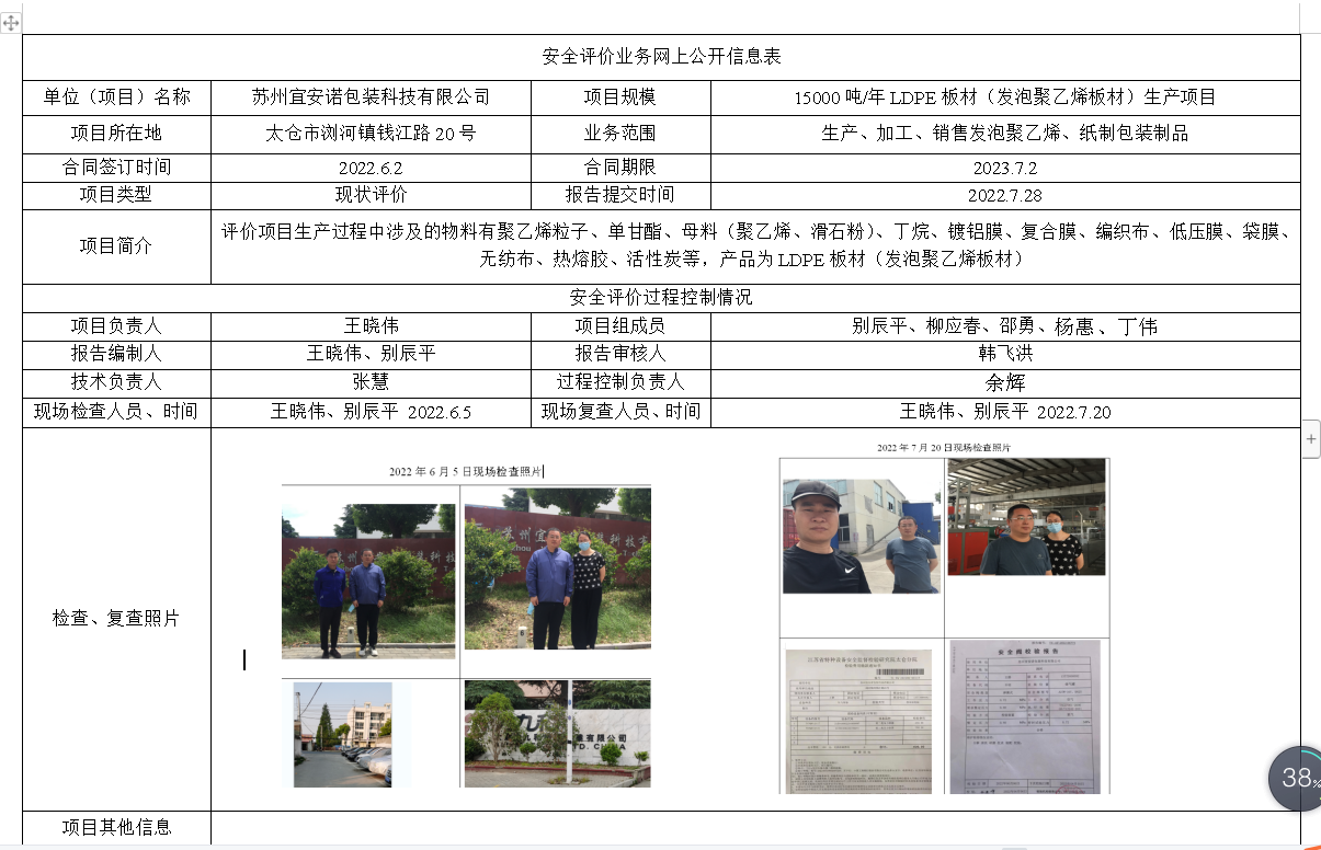 苏州宜安诺包装科技有限公司15000吨/年LDPE板材(发泡聚乙烯板材)生产项目