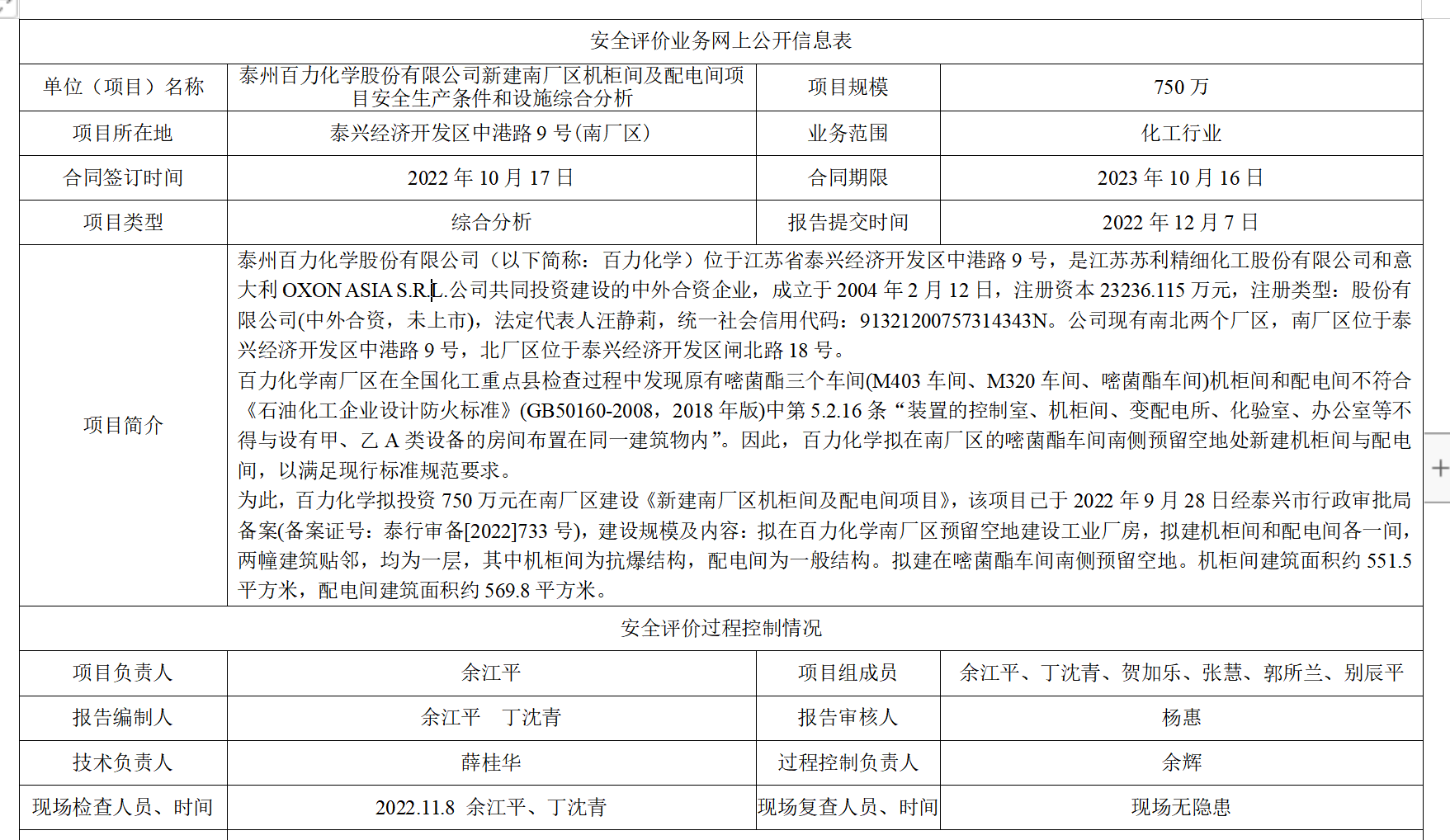 泰州百力化学股份有限公司新建南厂区机柜间及配电间项目安全生产条件和设施综合分析