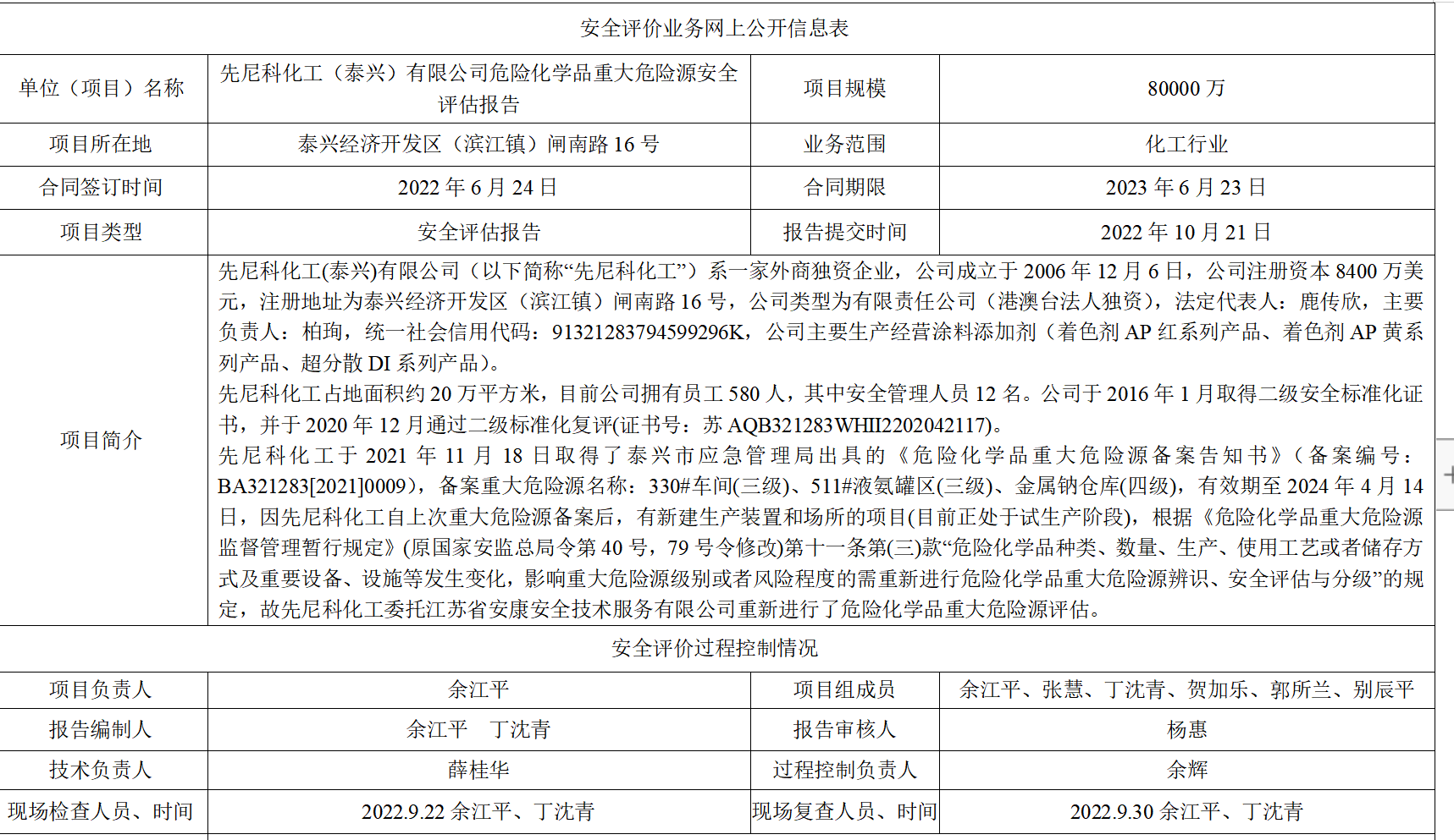 先尼科化工(泰兴)有限公司危险化学品重大危险源安全评估报告