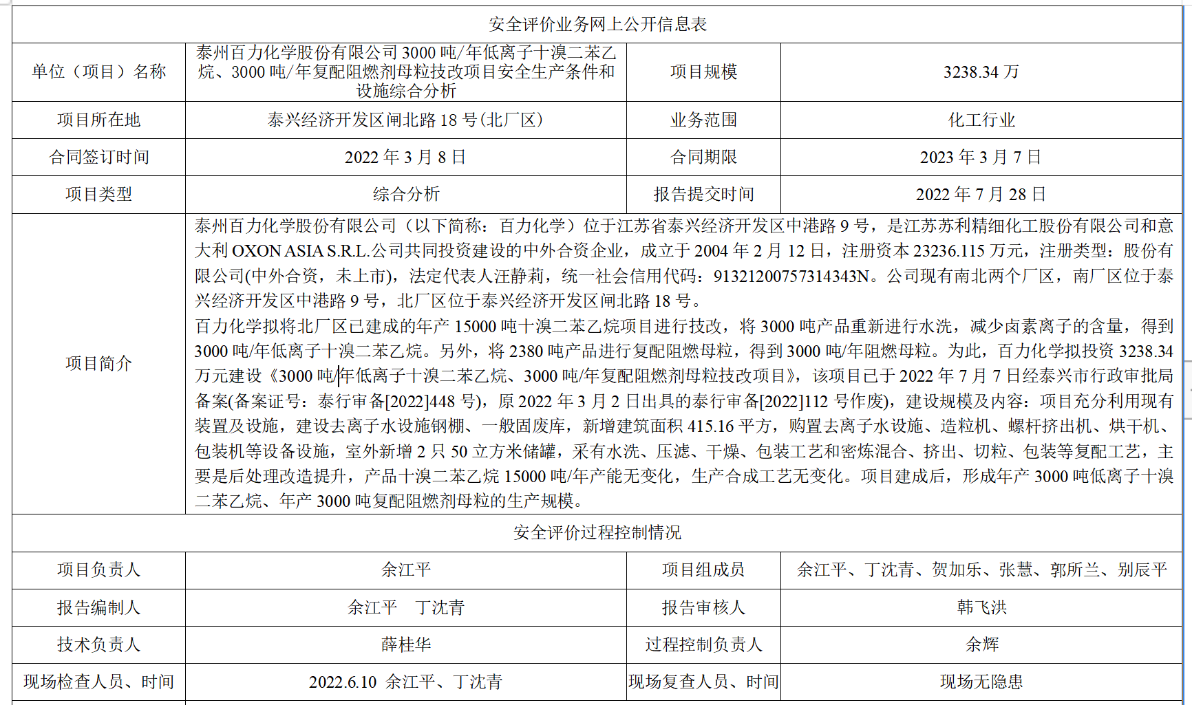 泰州百力化学股份有限公司3000吨/年低离子十溴二苯乙烷、3000吨/年复配阻燃剂母粒技改项目安全生产条件和设施综合分析