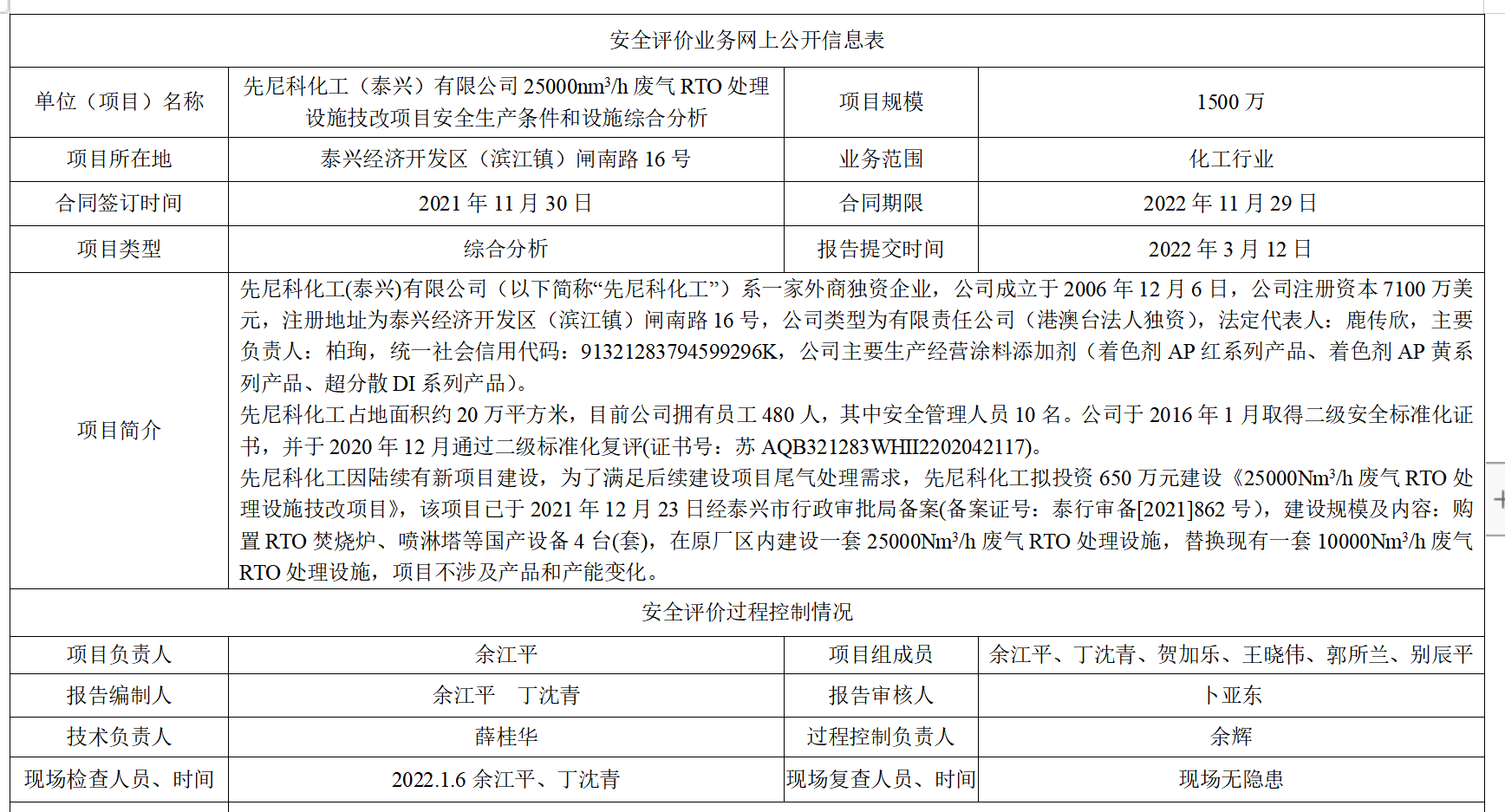 先尼科化工(泰兴)有限公司25000nm3/h废气RTO处理设施技改项目安全生产条件和设施综合分析