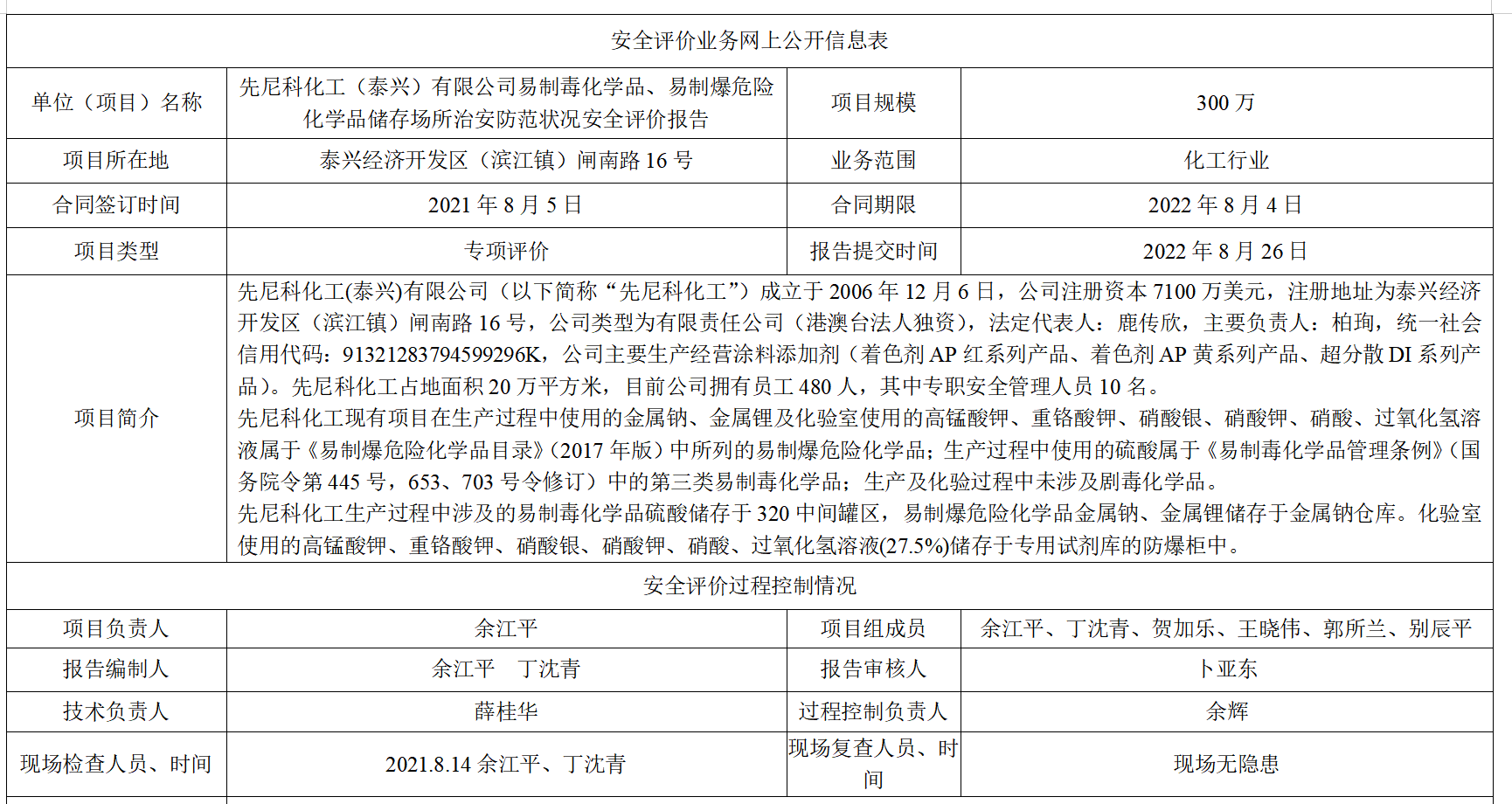 先尼科化工(泰兴)有限公司易制毒化学品、易制爆危险化学品储存场所治安防范状况安全评价报告