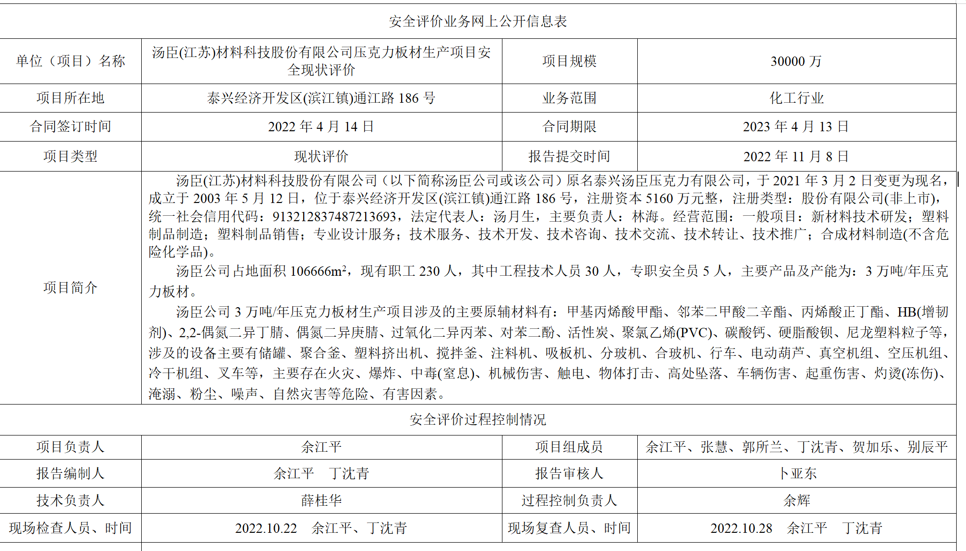 汤臣(江苏)材料科技股份有限公司压克力板材生产项目安全现状评价