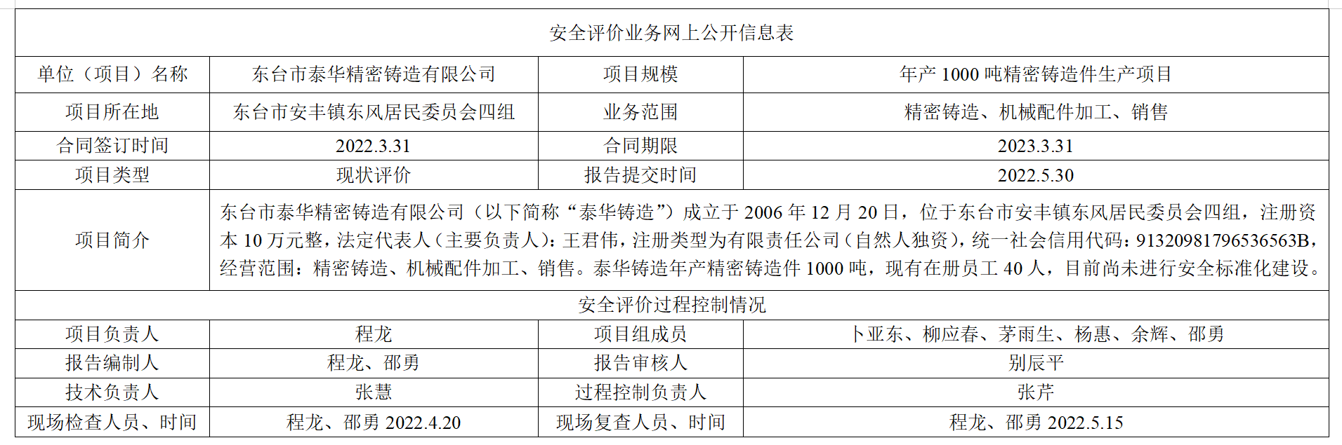 东台市泰华精密铸造有限公司年产1000吨精密铸造件生产项目